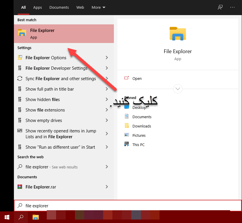 توجه:در صورتی که نتوانستید فایل اکسپلورر را در Taskbar پیدا کنید در قسمت search ویندوز این را تایپ کنید.